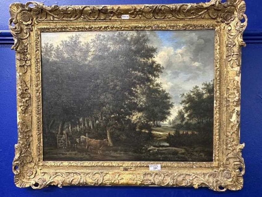 Oil on canvas, relined, rural wooded landscape, herdsman and cattle in foreground, deer and cottage in background. Gilt frame with plaque 'James Stark 1794-1859'. 24ins. x 17ins.