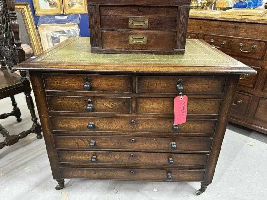 20th cent. Map desk two banks of two short over four long drawers topped with a tooled skiver, the whole on cup and cover castors. 35ins. x 27ins. x 31ins.