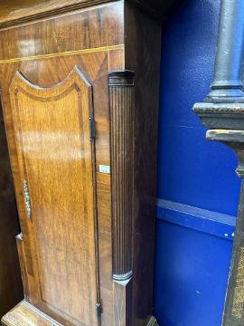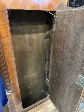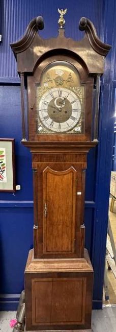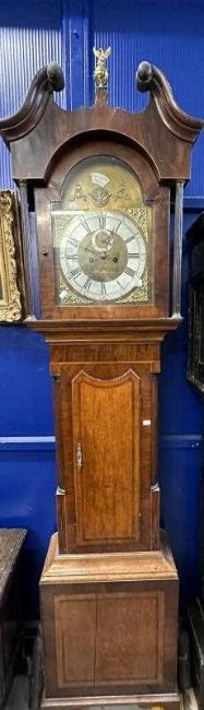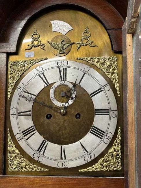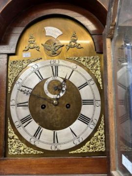 18th cent. North Country mahogany longcase eight day clock by Thomas Kefford of Royston (active 1710-50). Brass face with eagle and foliate decoration, silvered chapter ring, subsidiary seconds dial and Roman numerals. Dark mahogany case with brass and carved column decoration. 90ins. Tall x 22ins. Wide at widest point.