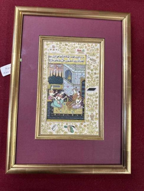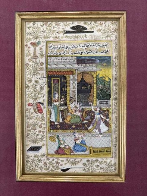 20th cent. Watercolour, Mogul palace scene with dancers, framed and glazed.