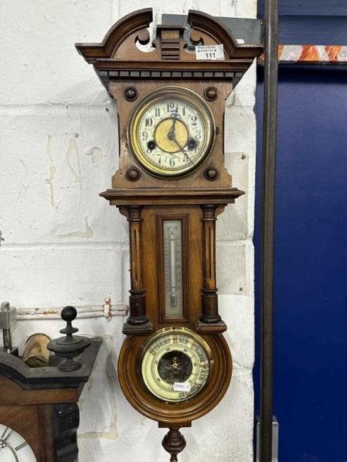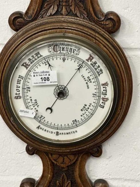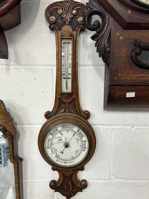 Early 20th cent. Combinatioin wall clock, barometer and thermometer, mahogany cased, and an oak cased aneroid barometer and thermometer.