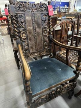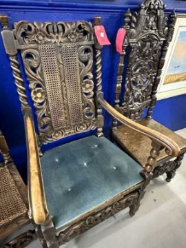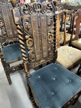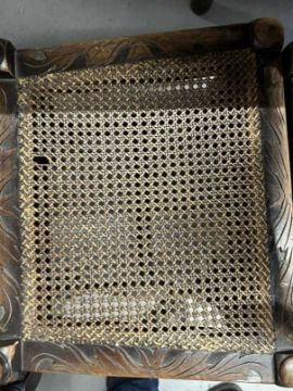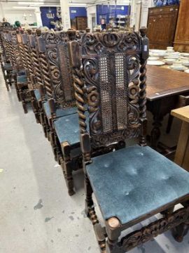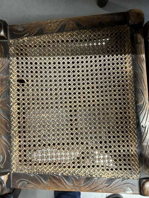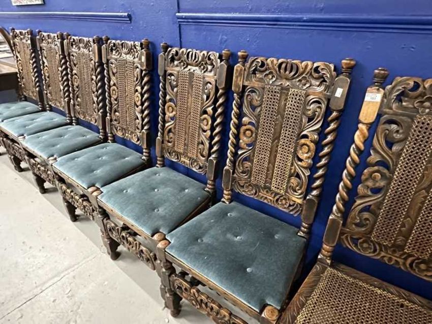 19th cent. Stained beech Carolean chairs Bergere seats and backs, the seats with solid upholstered tops. (7 chairs and 1 carver)