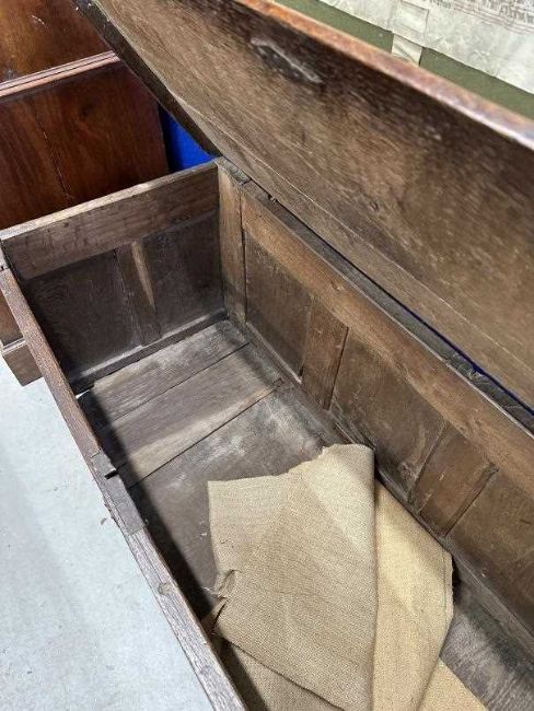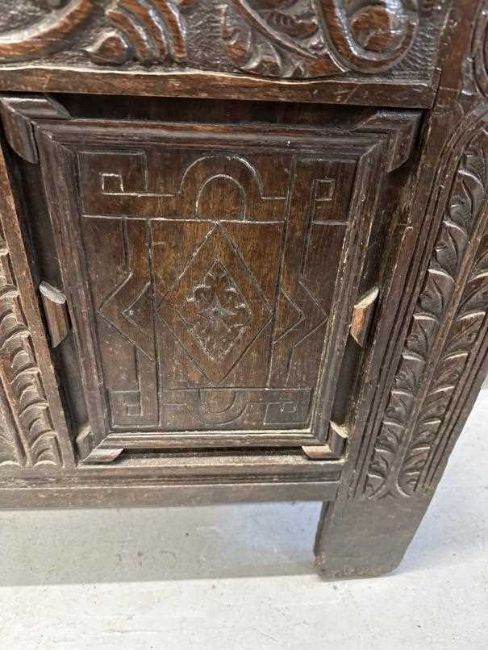 18th cent. Oak coffer decorated in high relief with chip carving. 48ins. x 24ins. x 48ins.