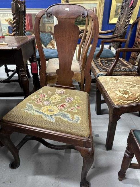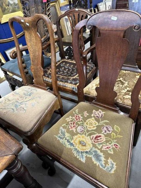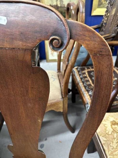 18th cent. Harlequin walnut and mahogany set of four dining chairs including carver, some peg jointed, drop-in seats. Two with square supports and stretchers, one with cabriole supports and no stretchers, one with turned and shaped stretchers, one with unusual stretchers plus a 1948 receipt for £14.00 from Richard Grose B.A.D.A.