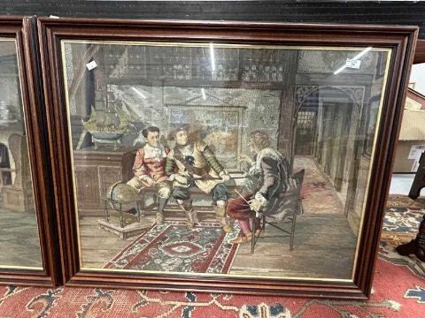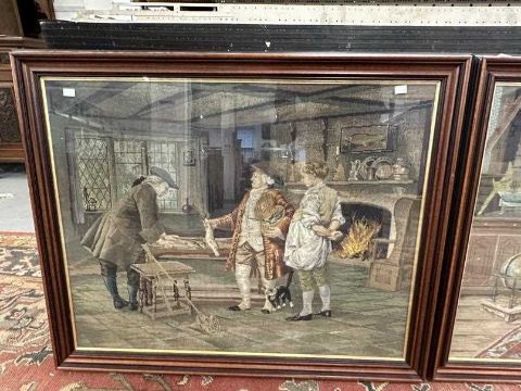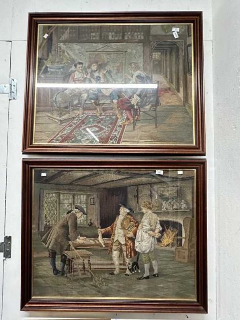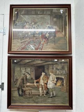 19th cent. Woolwork Tapestries:One with three figures, one holding fish in an interior, the other with three figures seated in an interior possibly mariners, with ship, globe and map on wall. Both framed and glazed. 31ins. x 39ins. (2)