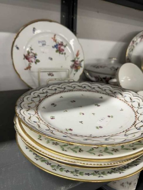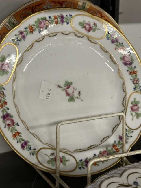 Late 18th/19th cent. Paris porcelain plates, including Dihl et Duerhard, Bordeaux, rue de Petit Carrousel, La Courtille, rue Thiroux, and Cligancourt, variously painted with flowers, cornflower sprigs, scattered blooms and formal borders, and a Coalport plate painted in the French style. Damages. 10ins. Max. (9)
