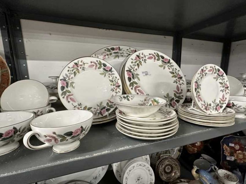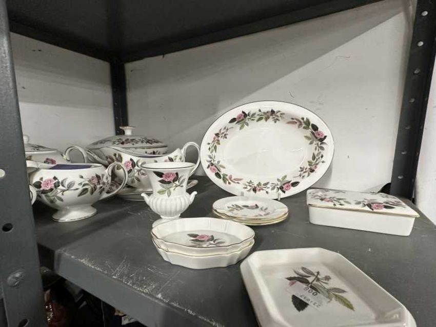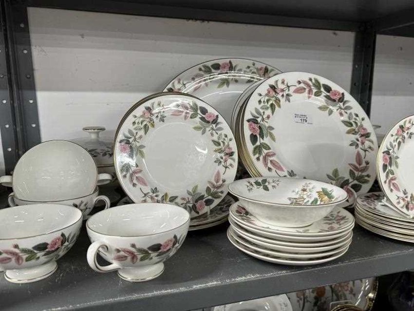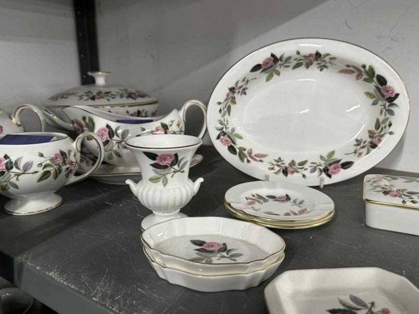Wedgwood Hathaway Rose dinner service comprising eight of each 10½ins, 8ins, 6ins plates, saucers x 6, handled soup bowls/cups x 2, gravy boat and dish, vegetable tureens x 3, vegetable dish, 15ins oval serving plate, plus eight miscellaneous pieces. (56 in total)