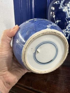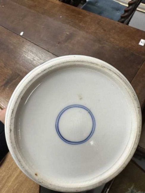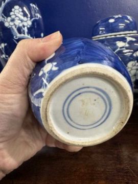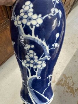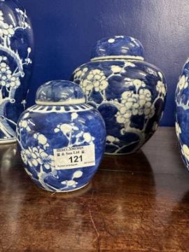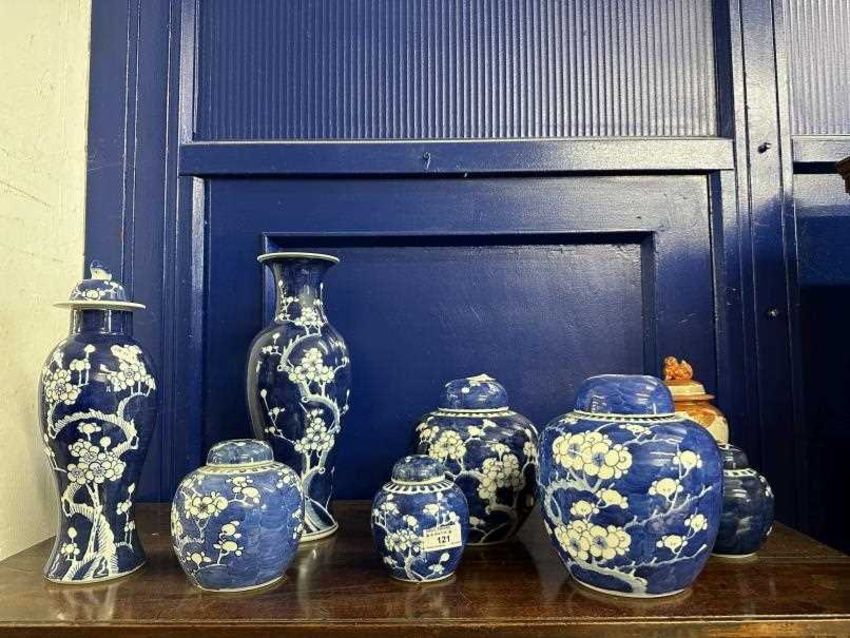 Mixed collection of 20th cent. Chinese ginger jars and baulster vases cobalt blue decorated with prunus flowers and blossoms (7). Plus Japanese kutoni jar and cover, restoration to rim. 9ins.