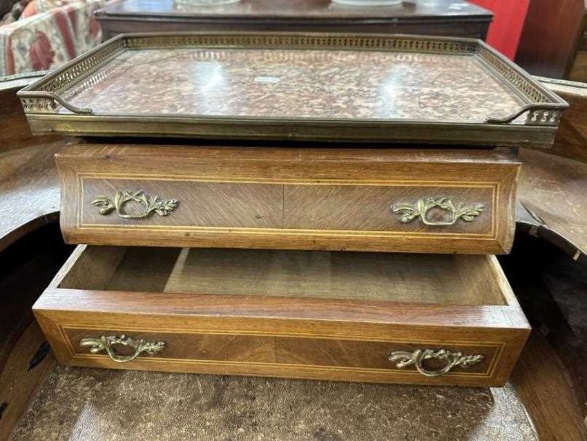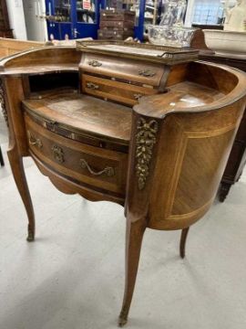 20th cent. French bonheur du jour of cylinder form, cross banded walnut with gilt brass fitting, two drawers above writing slope, side compartments, a drawer beneath, on shaped supports, Marble Gallery. 36ins. x 22ins. x 31ins.