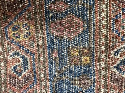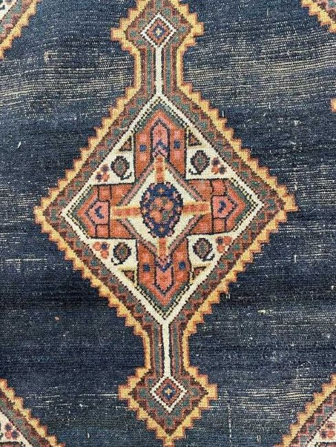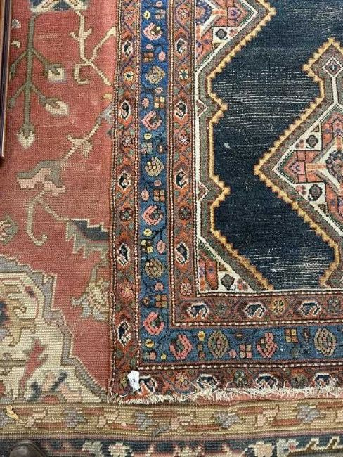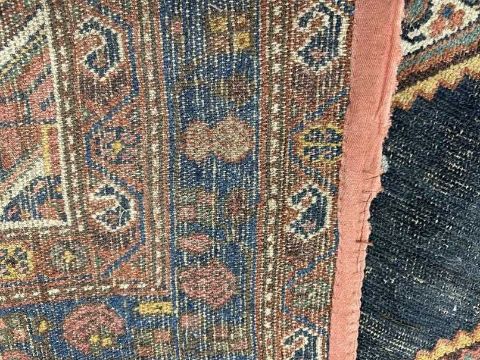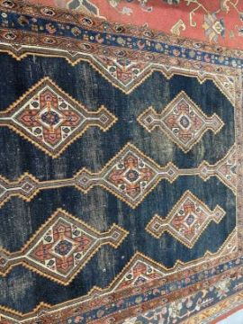 19th cent. Plain blue field with eight serrated and elongated medallions with red, green and blue stylised flowers in stylised geometric shapes, all enclosed by triple borders (signs of wear). 70¾ins. x 110¼ins.