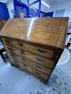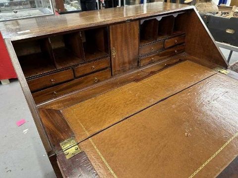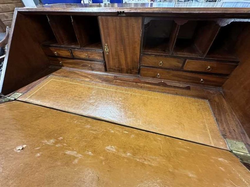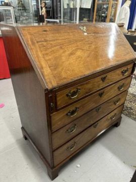 19th cent. Mahogany drop front bureau, four graduated drawers in fitted interior, brass furniture, on bracket supports. 36ins. x 21ins. x 41ins.