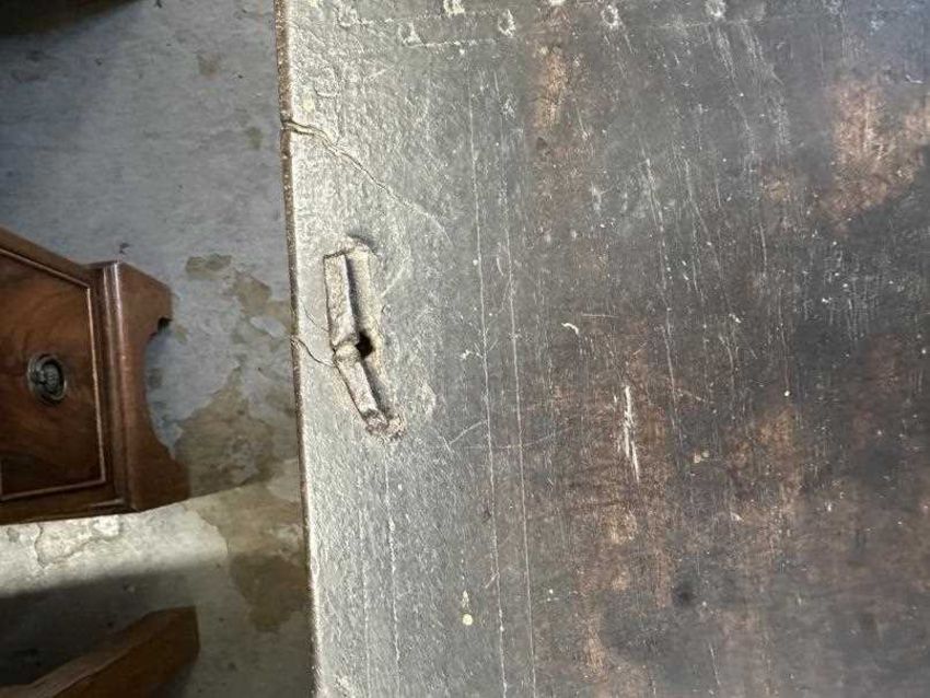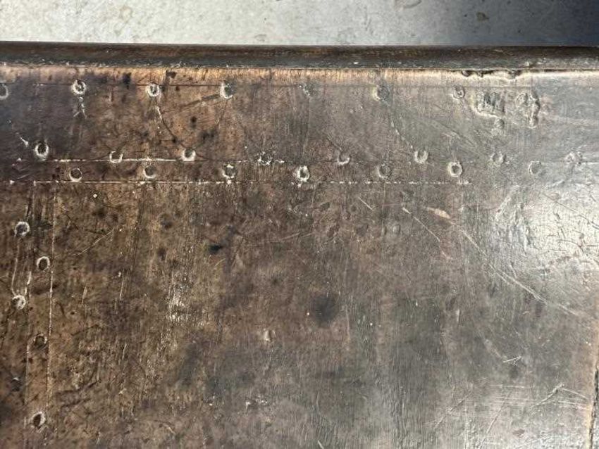 Late 17th/early 18th cent. Dwarf coffer of modest proportions with handmade nails and punched decoration. 32ins. x 21ins. x 13ins.