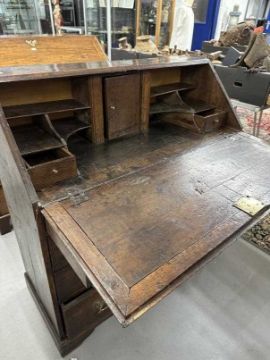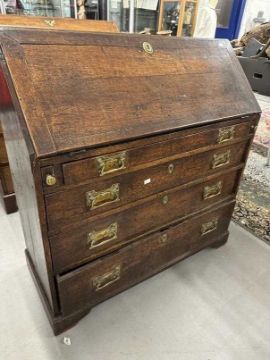 18th cent. Oak bureau, fall front, fitted interior over four drawers, on bracket supports. Original brass furniture. 38ins. x 16ins. x 36ins.