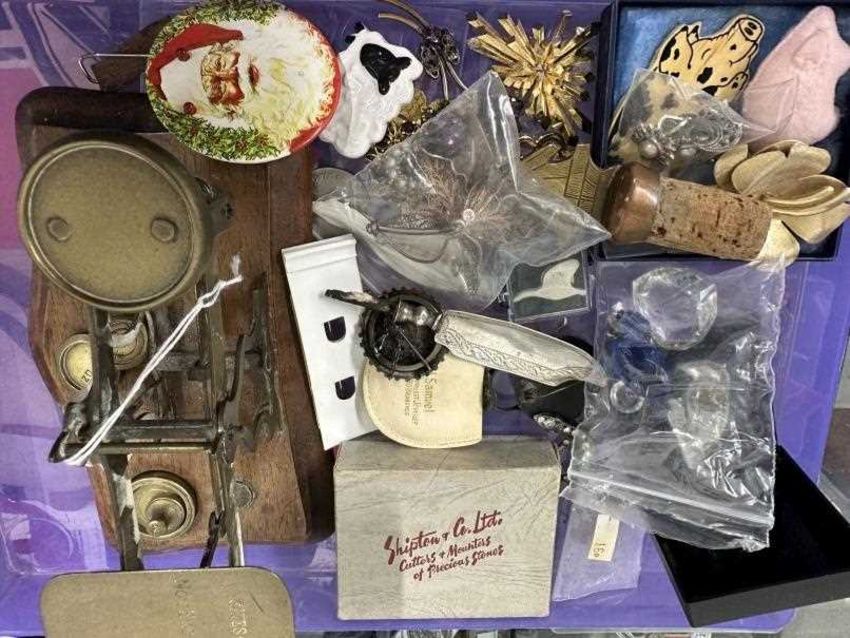 20th cent. Postal scales with weights, costume and other mixed items plus hallmarked silver blade of a butter knife.