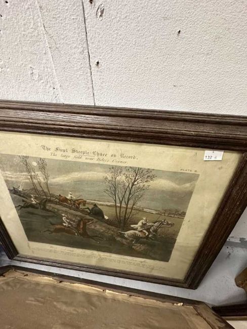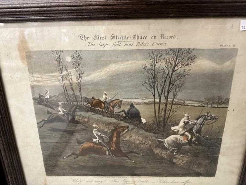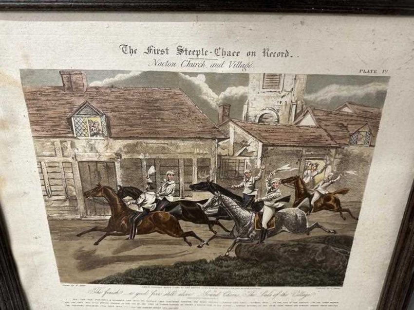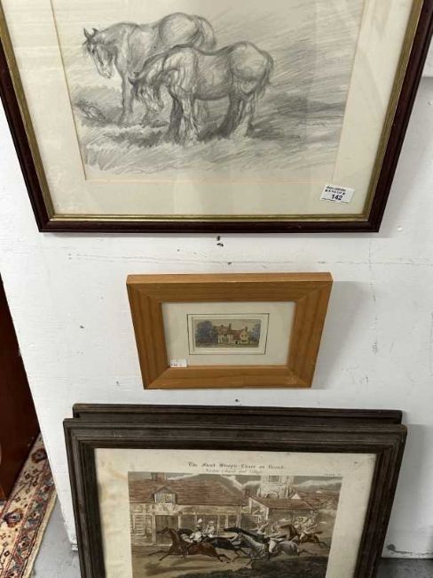 Anton Lock Ponies in a Field pencil/watercolour. Approx 7½ins. x 11½ins. Plus a pair of 19th cent. Equestrian engravings by J. Harris. Approx 14¾ins. x 18¾ins. The First Steeple Chase (4) plus a small Oliver Baker watercolour.
