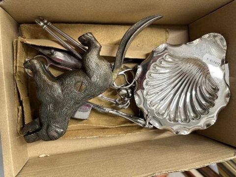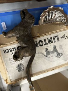 Silver plated nutcrackers x 2, wick trimmers x 2, butter dish A/f. Plus a novelty Linton puppy dog nutcracker.