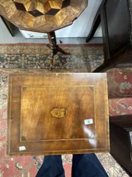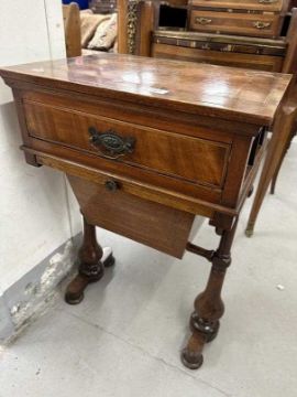 19th cent. Mahogany sewing table with inlaid oval motif above a drawer for sewing requisites. 18ins. x 14½ins. x 28ins.