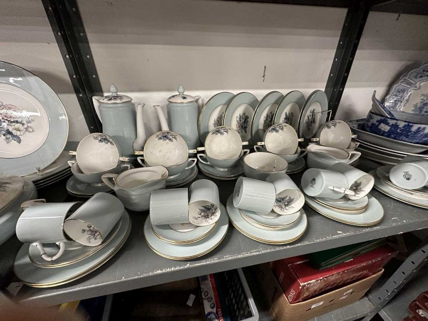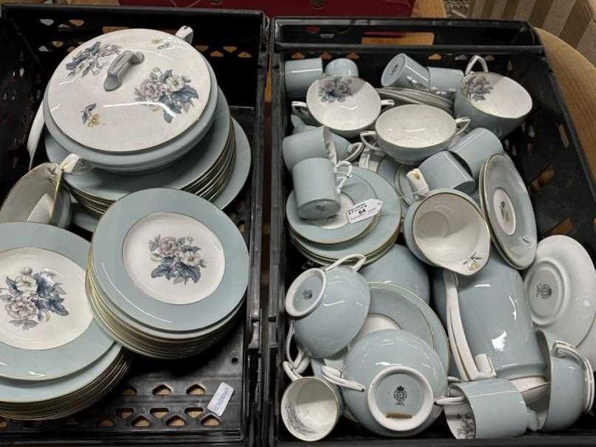 Royal Worcester Woodland pattern, vegetable tureens and covers x 2, coffee pots x 2, dessert bowls x 10, plates (8ins) x 10, cream jugs x 2, sugar, gravy boat and saucer, meat oval(13ins), coffee cans x 9, saucers x 10, two-handled soup bowls x 10, saucers x 9, side plates x 11, plates (10½ins) x 11 and butter pat.