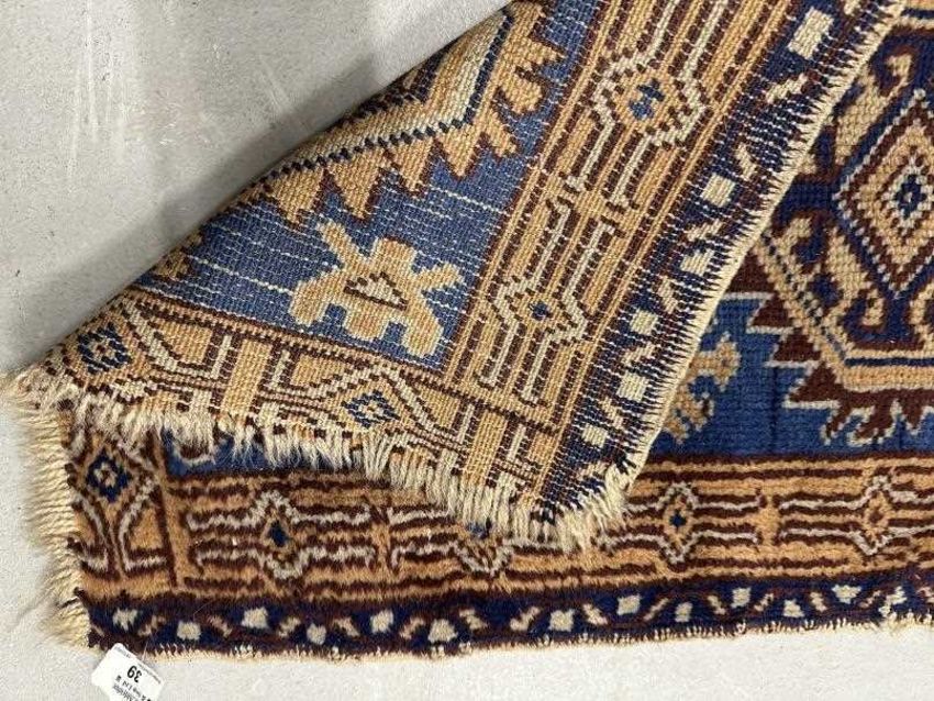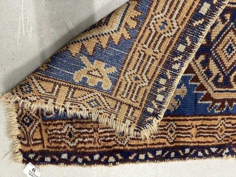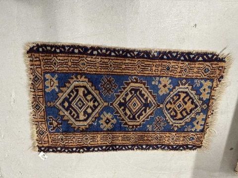 19th cent. Prayer rug, blue field of stylised animals centred with three serrated medallions and enclosed by two borders.