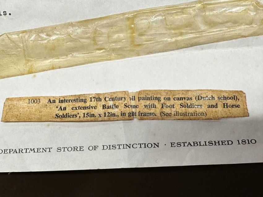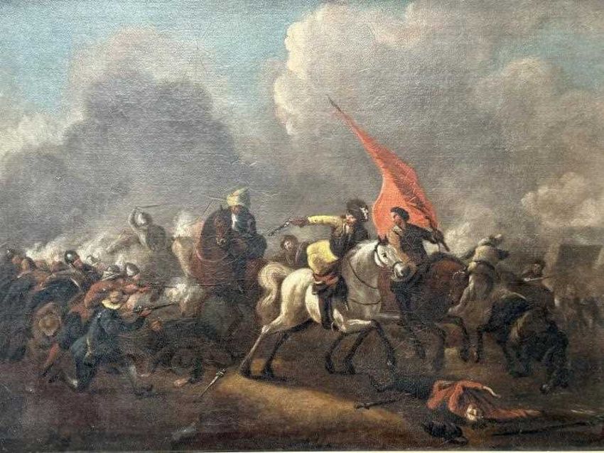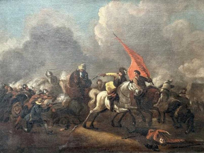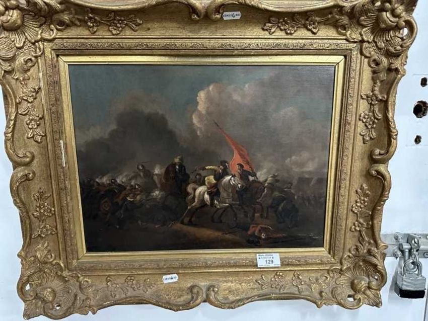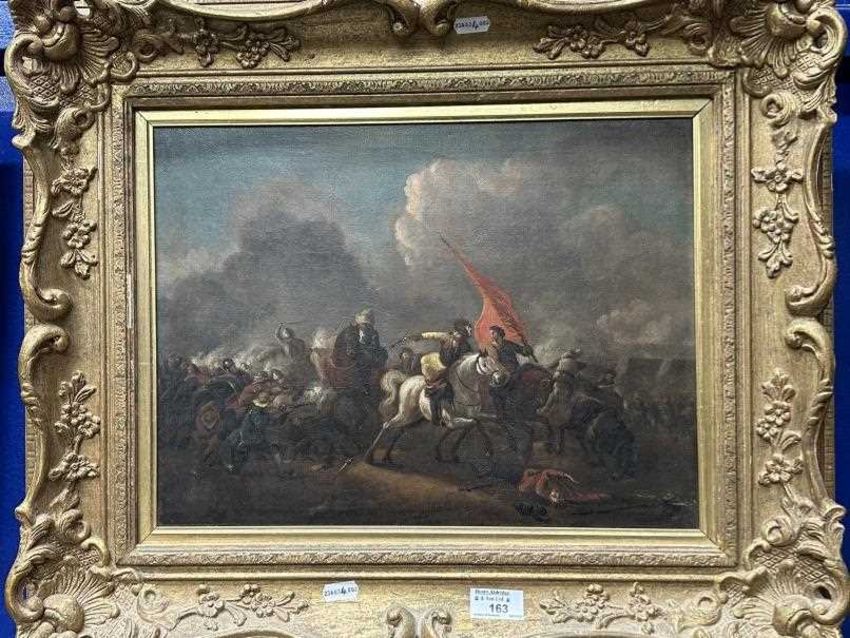 Oil on canvas Battle Study, unsigned, mounted horsemen one carrying an orange/red standard, another on a white horse surrounded by other foot soldiers, musketeers, swordsmen surround the melee. A catalogue cut-out on reverse 1003 states, extensive battle, from the Estate of the Late A.E Goodard. Plus 1975 letter from A. DeGHruchy of the Channel Islands authenticates 'Battle Scene', gilt framed and relined. Approx. 16½ins. x 13½ins.