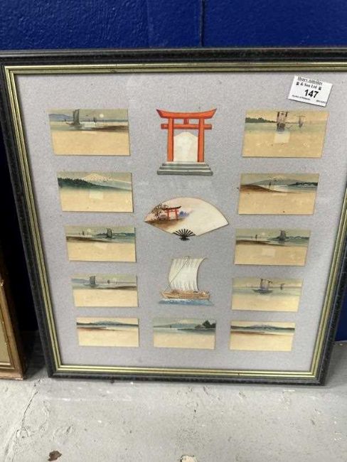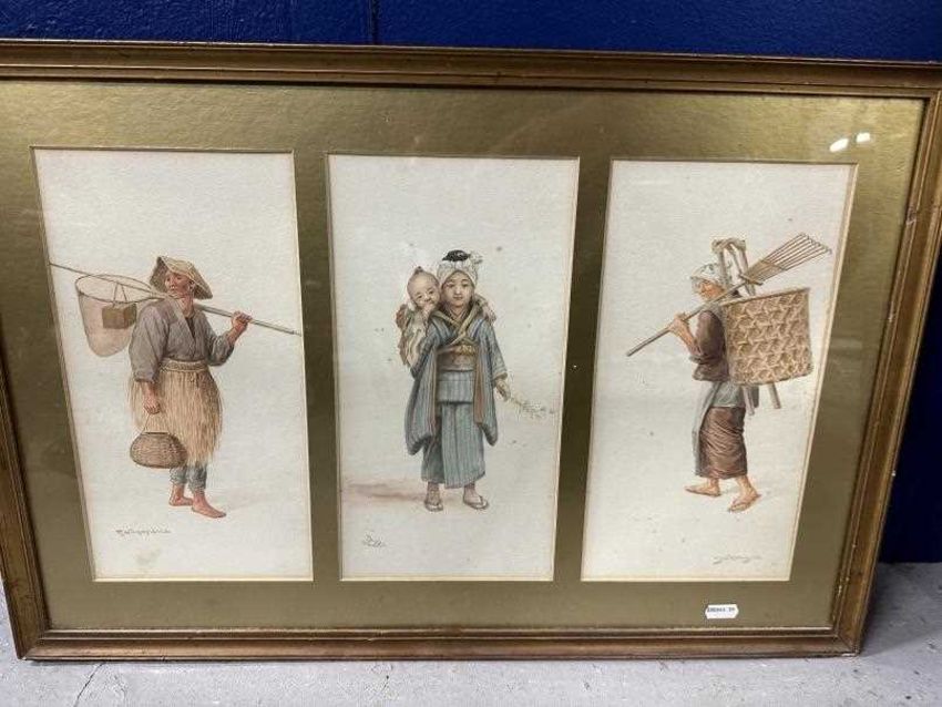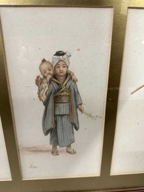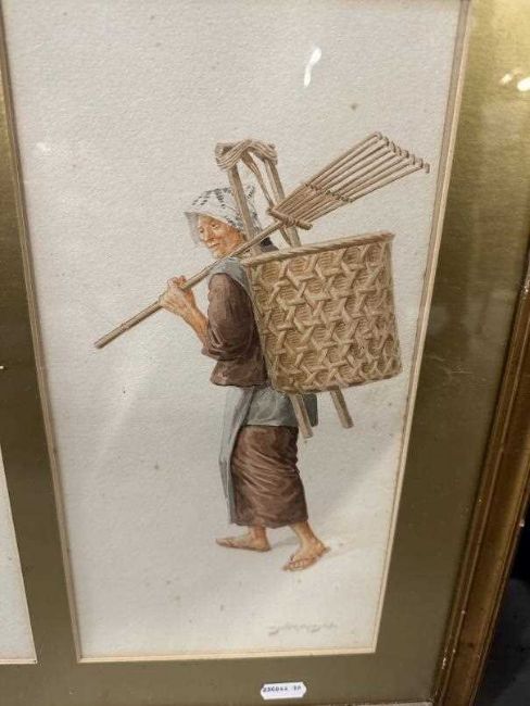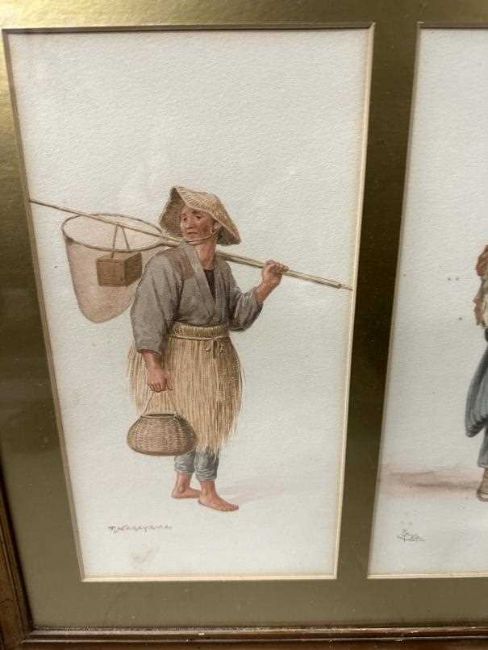 Watercolours of Japanese working people 6ins. x 12ins. (2) another signed signed example, plus a framed set of unsigned Japanese watercolours, each measuring 3ins. x 2ins.