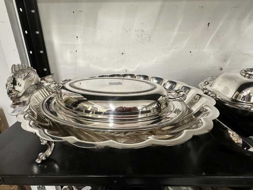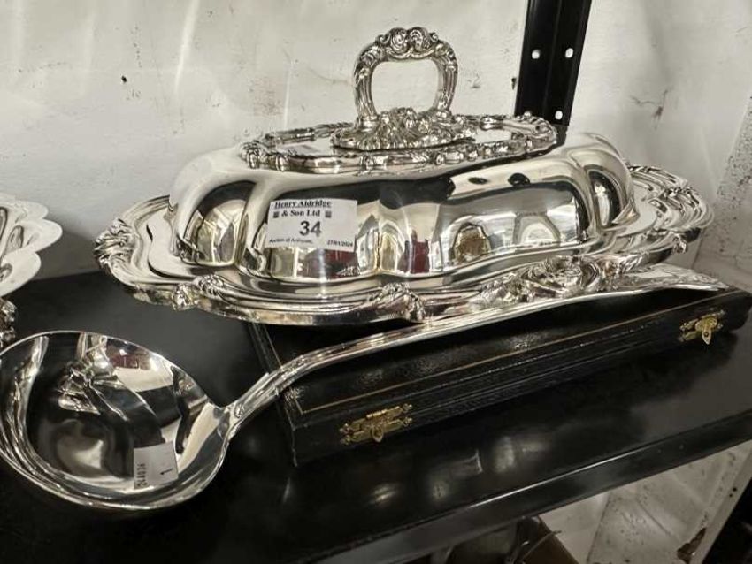 Silver-plated large scallop-shaped serving dish with a handle in the form of a fish. 16ins. x 13ins. Plus a white metal ladle, two lidded serving dishes and a boxed set of cake knives and forks.