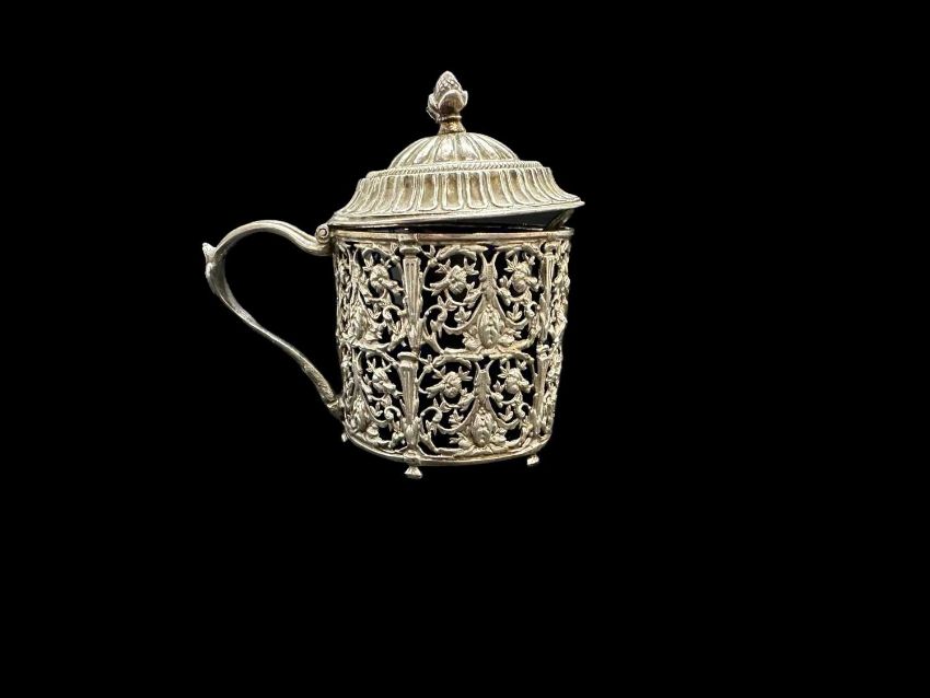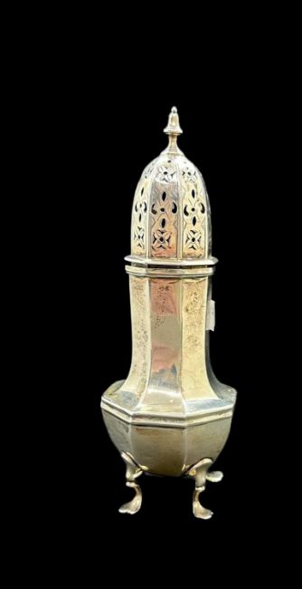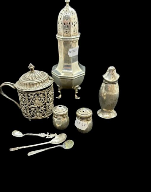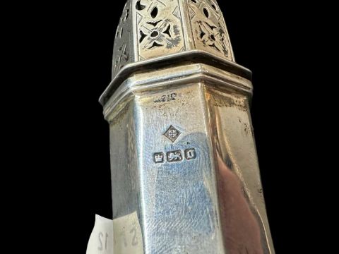 Sugar caster of octagonal form, Sheffield 1906, French white metal drum mustard, Minerva marks, plus a pair of small peppers, etc. Weighable 7.1ozt.