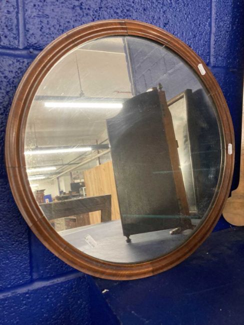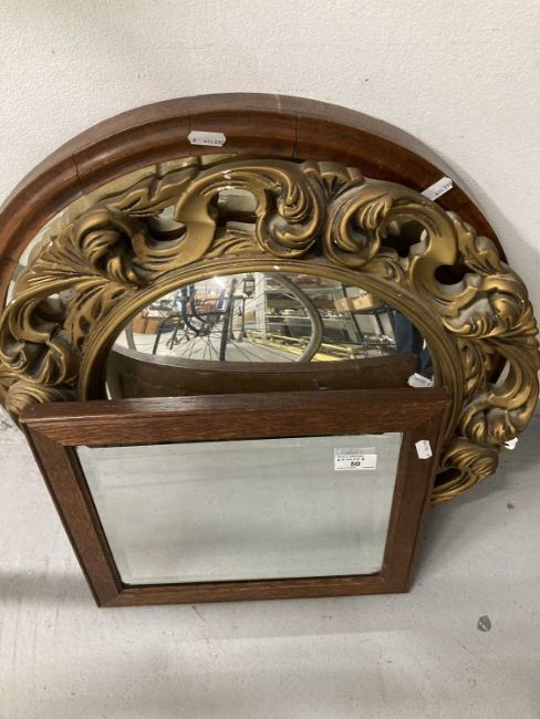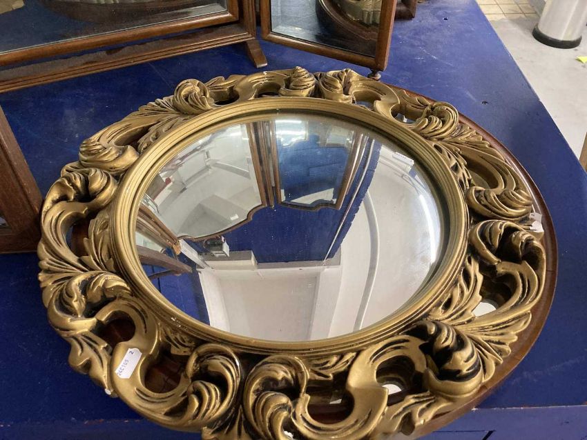 20th cent. Wall mirrors one Edwardian oak framed with original bevelled plate, 32cm x 38cm. One Edwardian circular mahogany framed mirror 52cm across and one modern gilt plaster framed convex mirror with slight losses, 51cm across. (3)