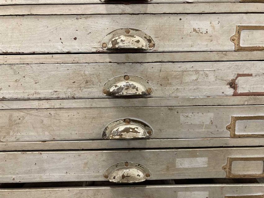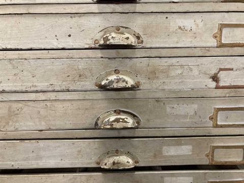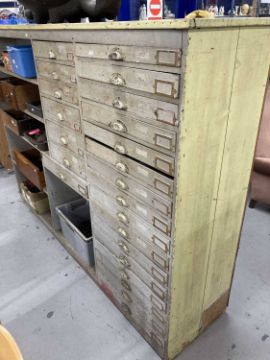 20th cent. Pitch pine workshop storage unit with twenty-three drawers and six storage compartments, all drawers with brass shell handles and contents label holders. 80ins. x 57ins. x 17ins.