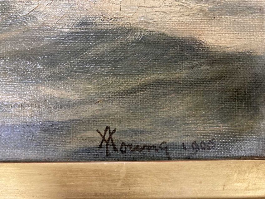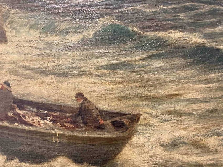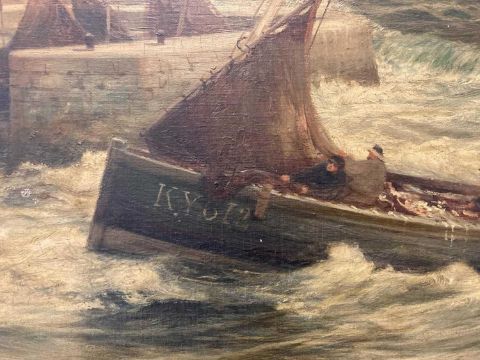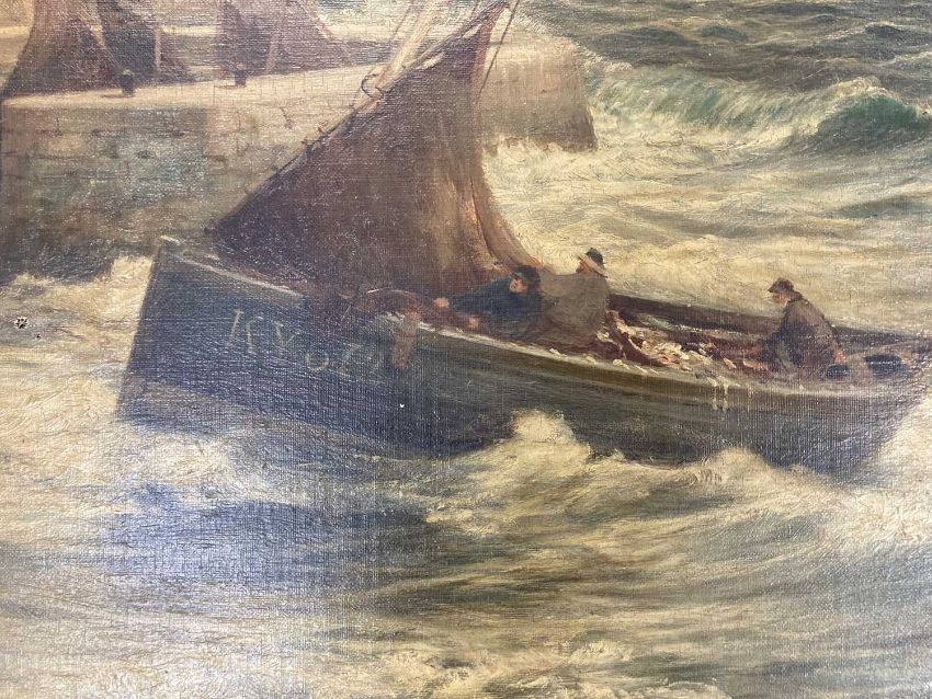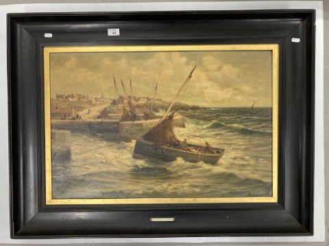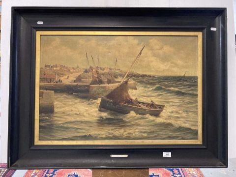 Oil on canvas, harbour/seascape, bringing in the catch to Kirkcaldy/Fife signed and dated 1906, in ebonised frame with gilt slip. Slight damage in two places. Sight size 19½ins. x 29½ins. Frame size 29ins. x 39ins.