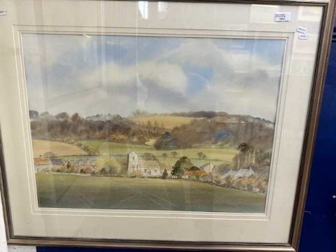 English School: David Rust (1963 - ) Watercolour 'Alderton a Cotswold Village'. Signed lower left, inscription to reverse 'With best wishes David Rust April 1988.' Framed and glazed, 93cm. x 76cm.