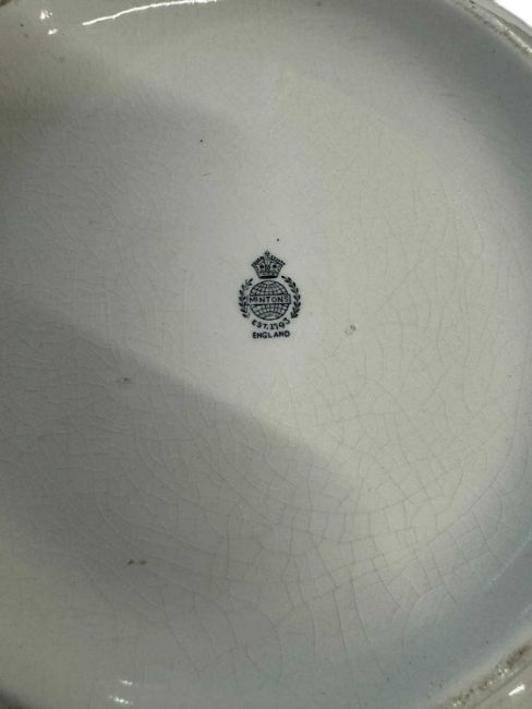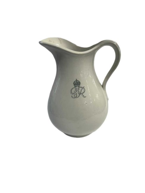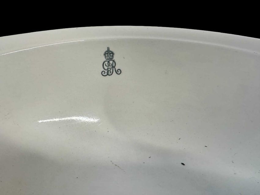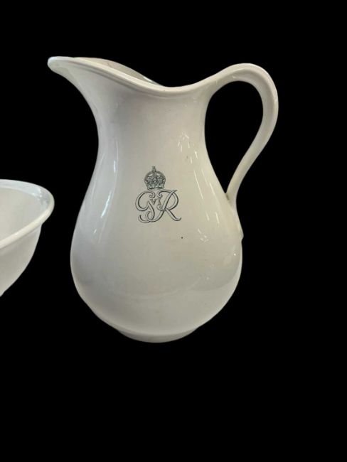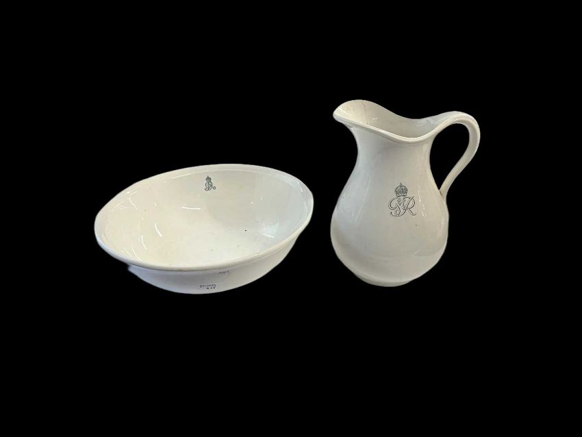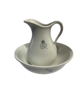 C1920s large wash bowl and jug. By repute from a Royal Residence manufactured by Minton marked to underside with manufacturers marks, King's cypher to centre on each. Bowl chipped to rim, 15ins. Jug 11ins.