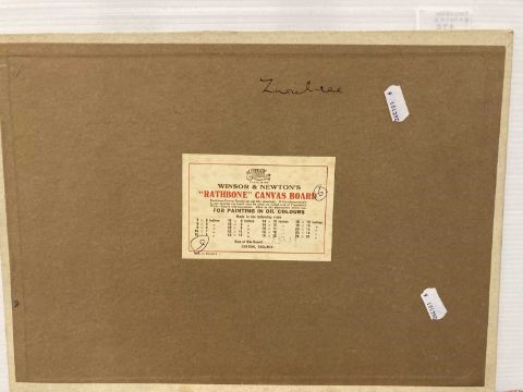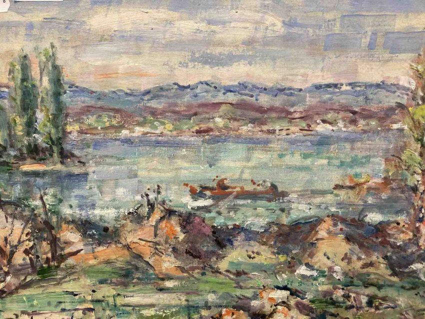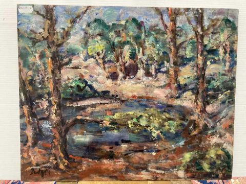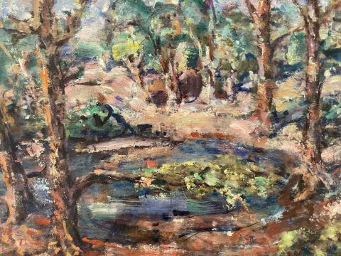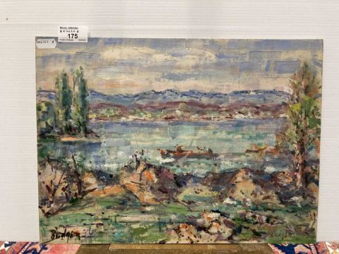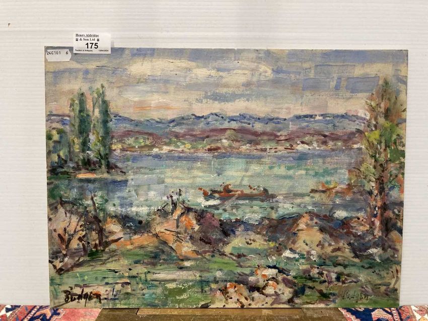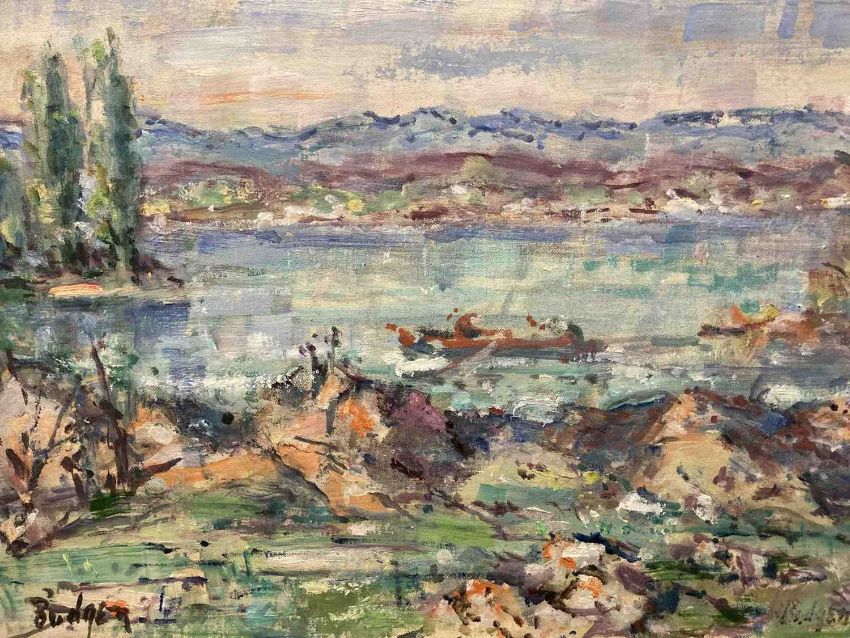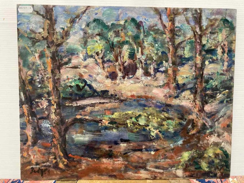 Oil on canvas card 'landscape with lake' signed twice lower left and right Budgen, signed to the reverse Zurich (Switzerland). 38cm x 28cm. Together with another Frank Budgen oil on board landscape and pond 'Hampstead Heath, London', signed lower left. 41cm x 33cm. (2)