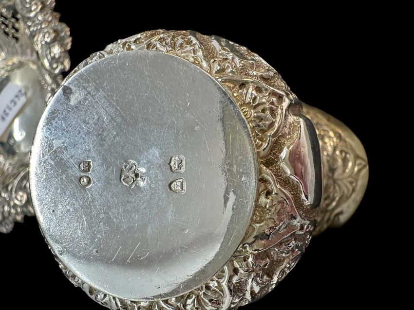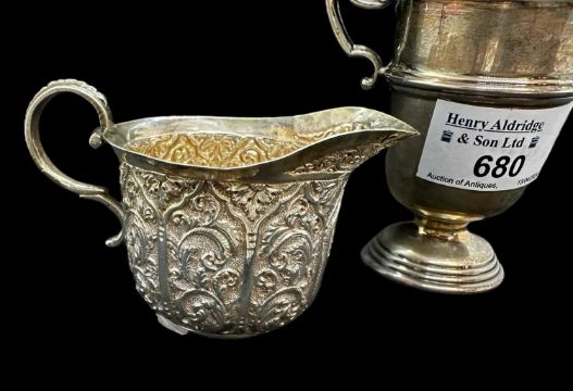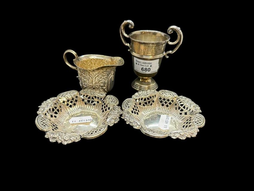 Pair of pierced dishes, Birmingham 1897, a silver two-handled trophy cup, Birmingham 1933 and a small cream jug, London 1887, combined weight 4.9ozt.