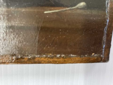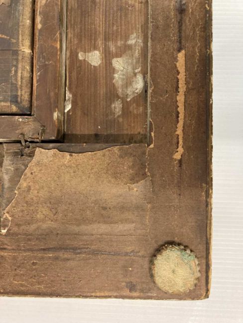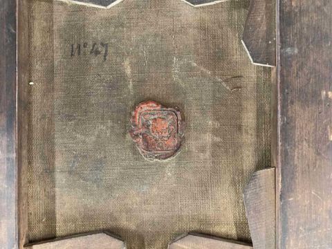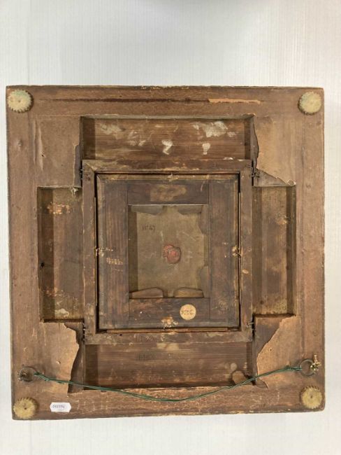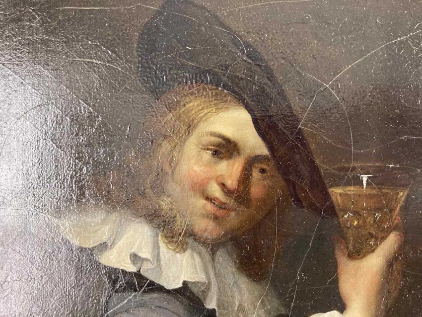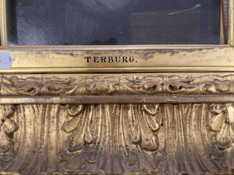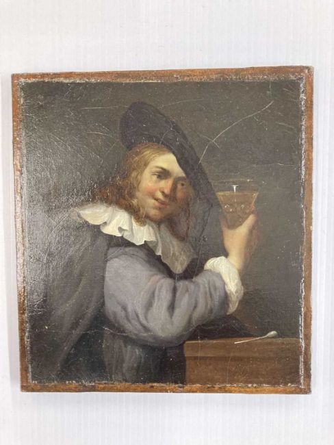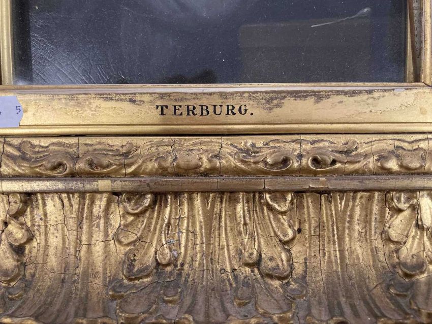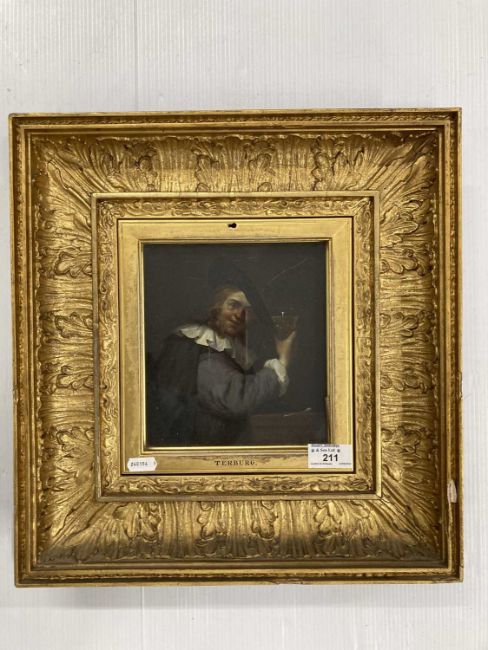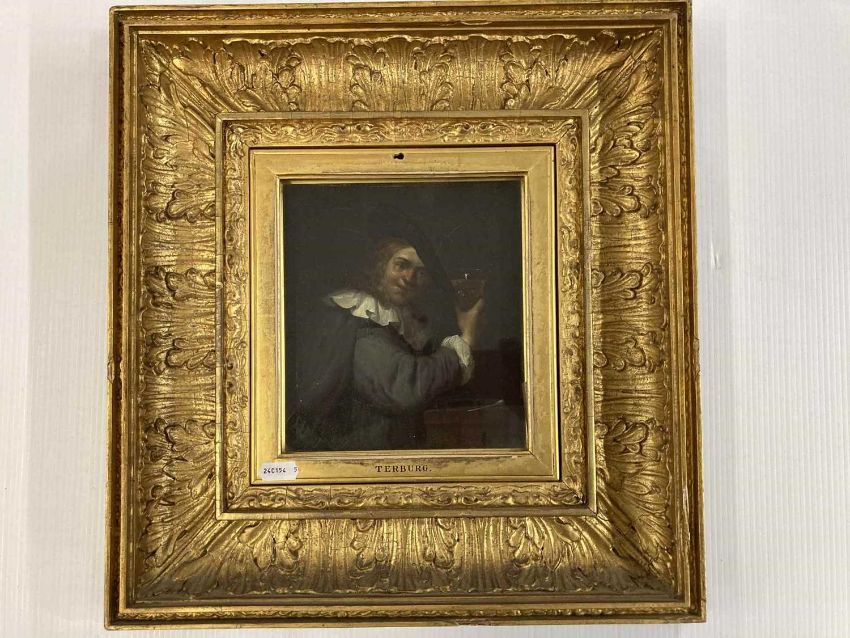 Gerard Ter Borch/Gerard Terburg (1617-1681): Oil on canvas of a gentleman toasting a drink, under a framed locked glass window set within a heavy giltwood carved frame, to the reverse the 3 separate sections of the framework bear the carved Roman numerals VII, two paper labels, a wax seal of coat of arms/armourial. and exhibition/inventory number in black No 42. Bearing the signature Terbugg under margin.