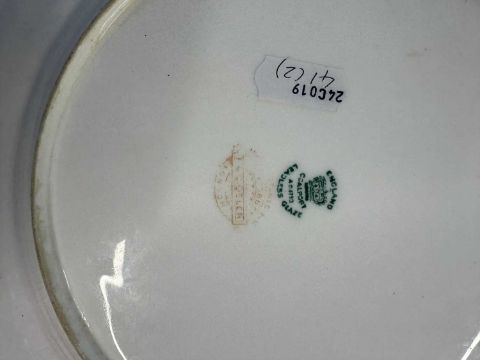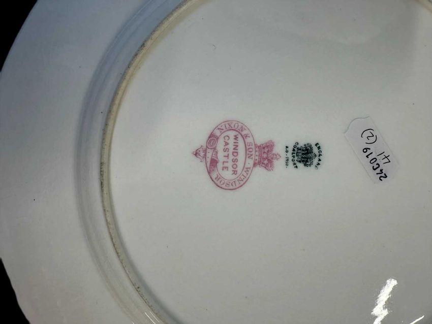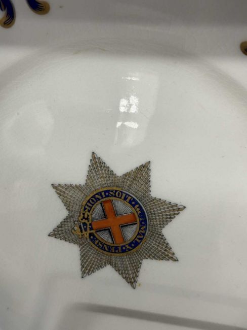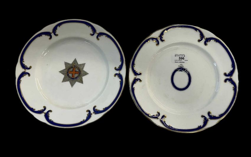 Her Majesty Queen Victoria Windsor Castle Garter State Service plate c1880 by Coalport, navy blue and gilding throughout, Garter device to centre, retailed by Nixon & Son, Windsor, marked to underside in Garter ‘Windsor Castle’. 10ins. Together with a similar plate A/F. (2)
