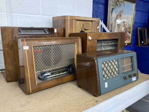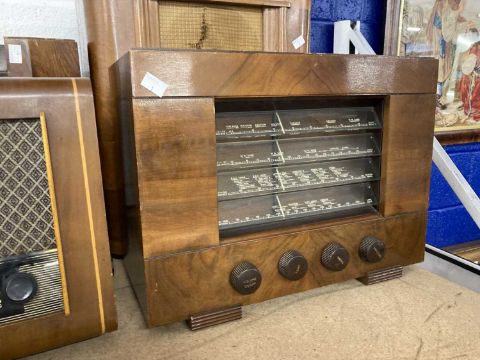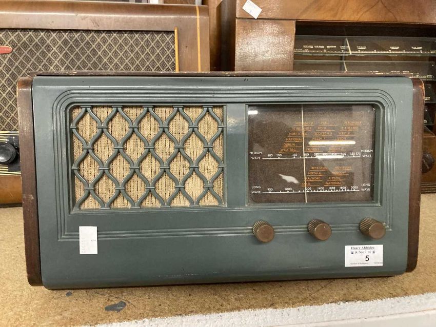 Mid 20th cent. Timber cased radios including Philips Lamps Ltd 797A, Buzih Radio S.W.43, His Master's Voice No. 1115, PYE 069022 and an unnumbered His Master's Voice with louvred glass frequency panel. (5)
