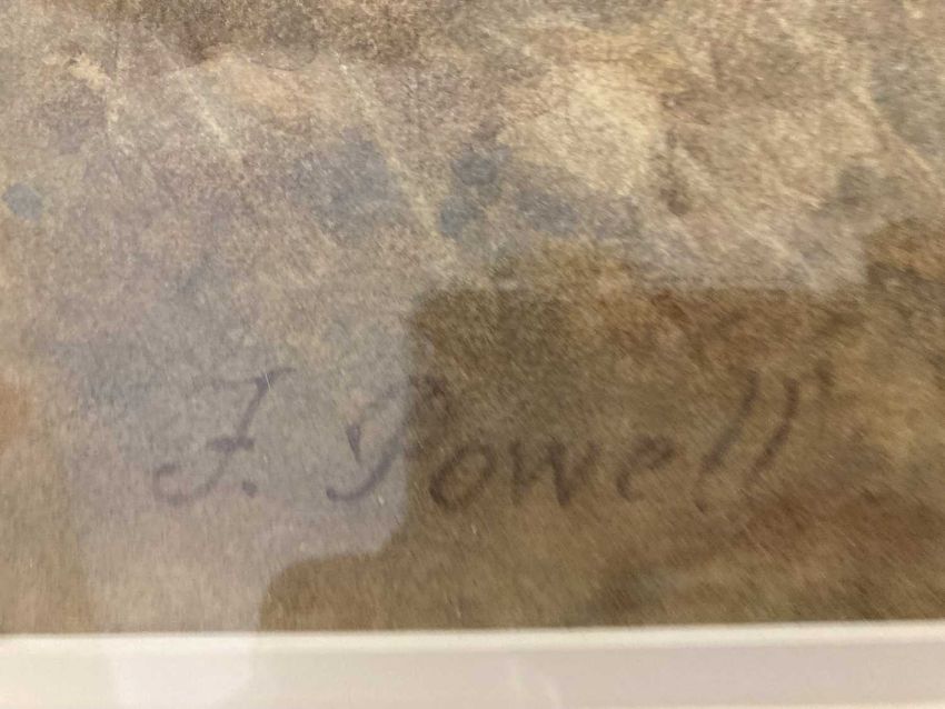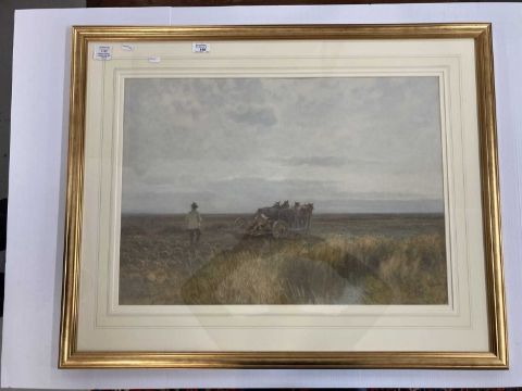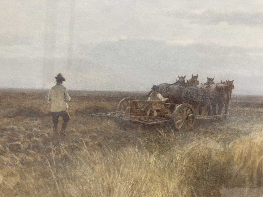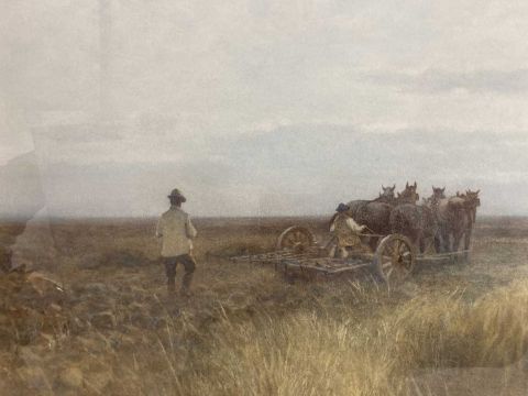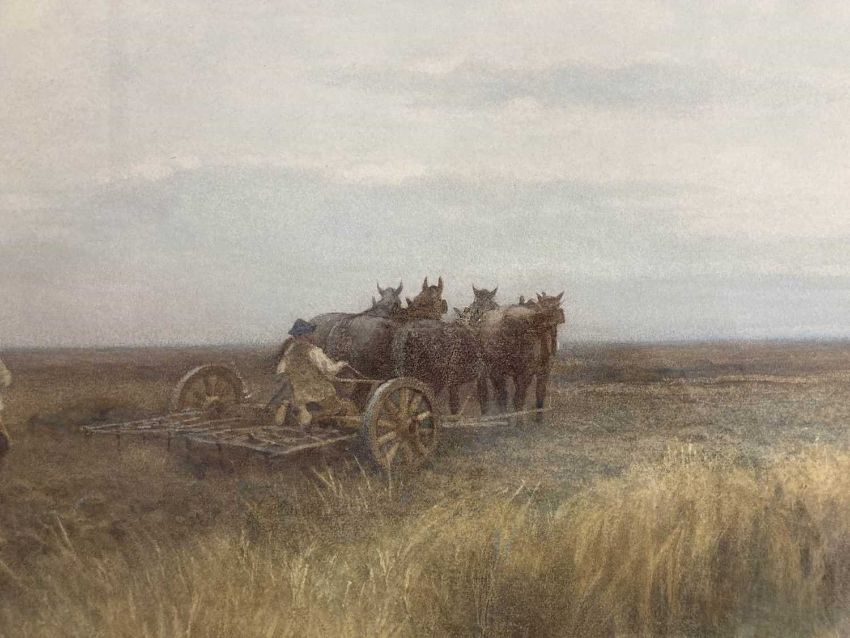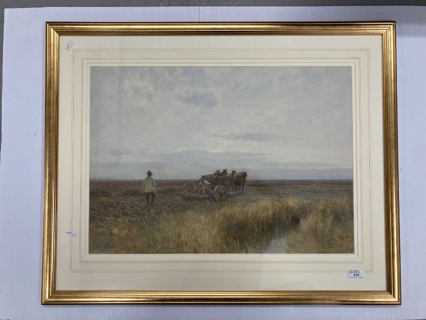 Watercolour, landscape with horse-drawn harrow, framed and glazed. 50cm x 72cm.