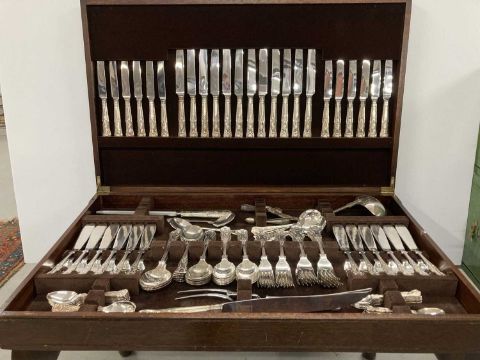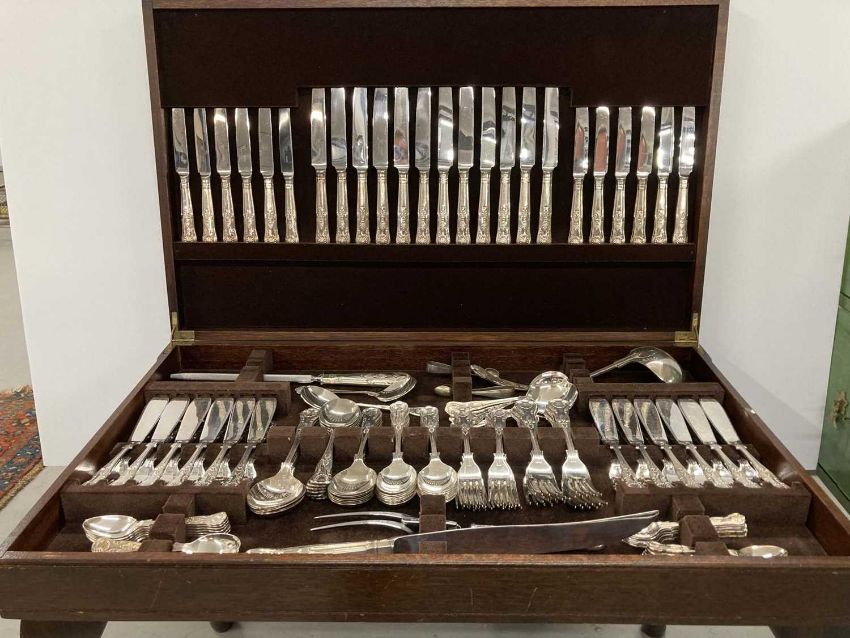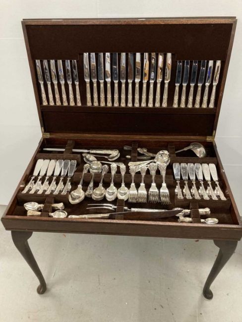 Platedware: 20th cent. Viners EPNS cutlery set in a bespoke box with leather liner and 4 legs.