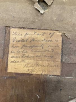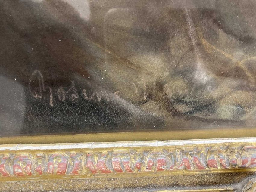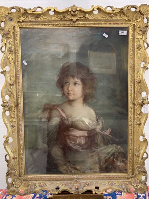 Italian pastel crayon, stunning child portrait of Violet Hudson dressed in a pink formal dress, glazed in a carved giltwood Flornetinian frame, signed on dress and description of sitter on verso. 36ins. x 28ins.