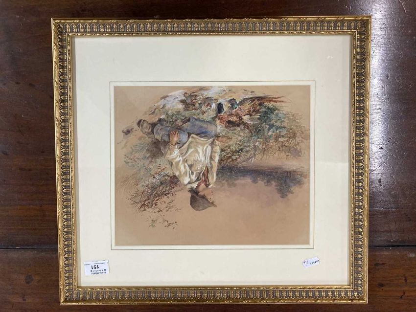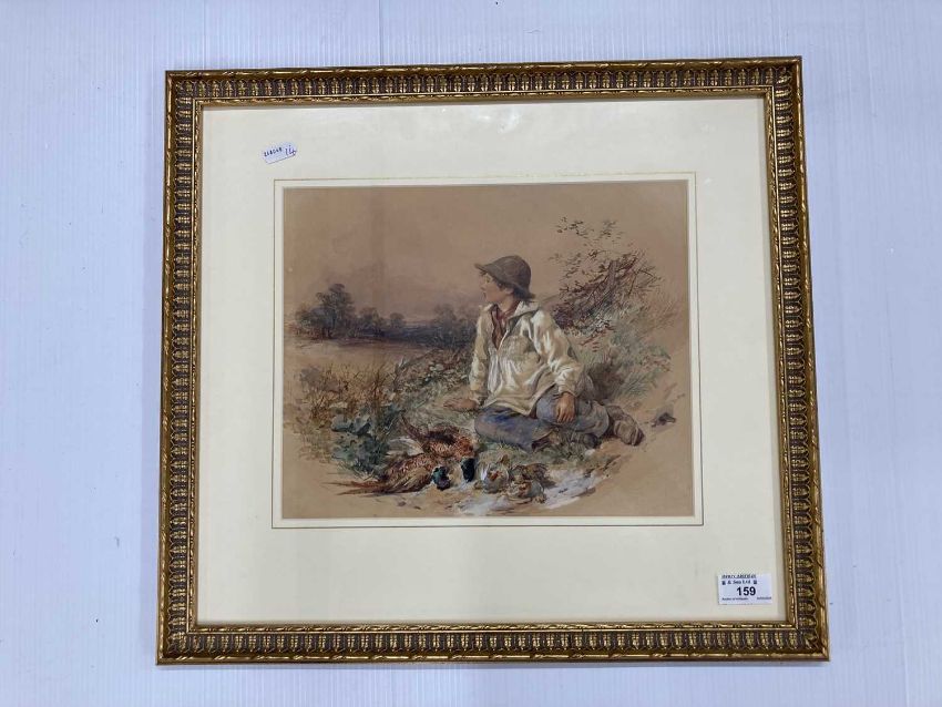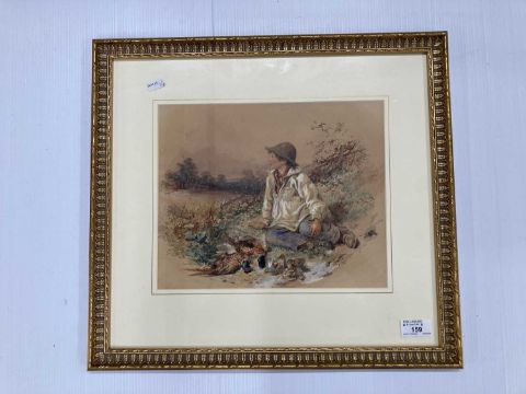 Watercolour 'The Young Gamekeeper' young boy seated beside a fence with dead game, signed lower left with the date 1862. 24½cm x 30cm.