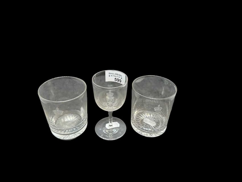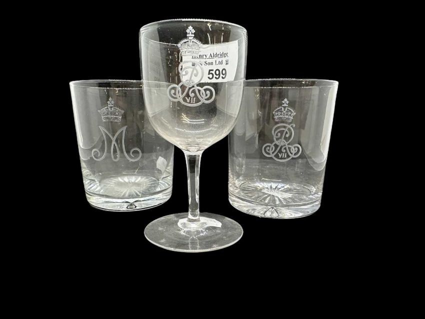 His Majesty King Edward VII Royal Household State Dinner Service - three items c1901 fine-cut crystal hand-engraved King's cypher to side on water glass 3ins, and cordial glass 4ins, together with a similar water glass bearing the hand-cut monogram of Queen Mary c1920. (3)