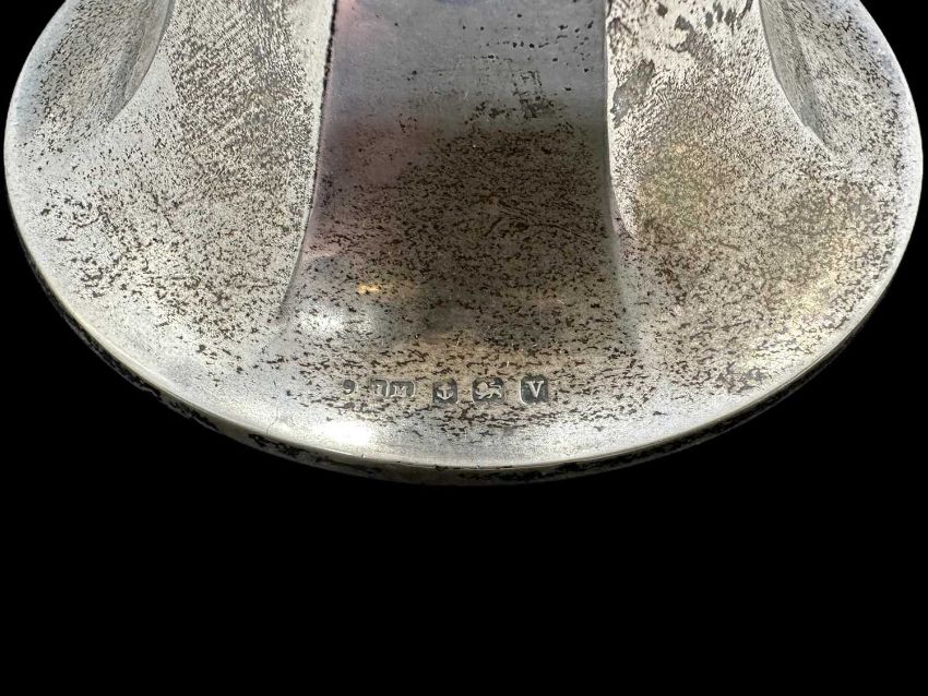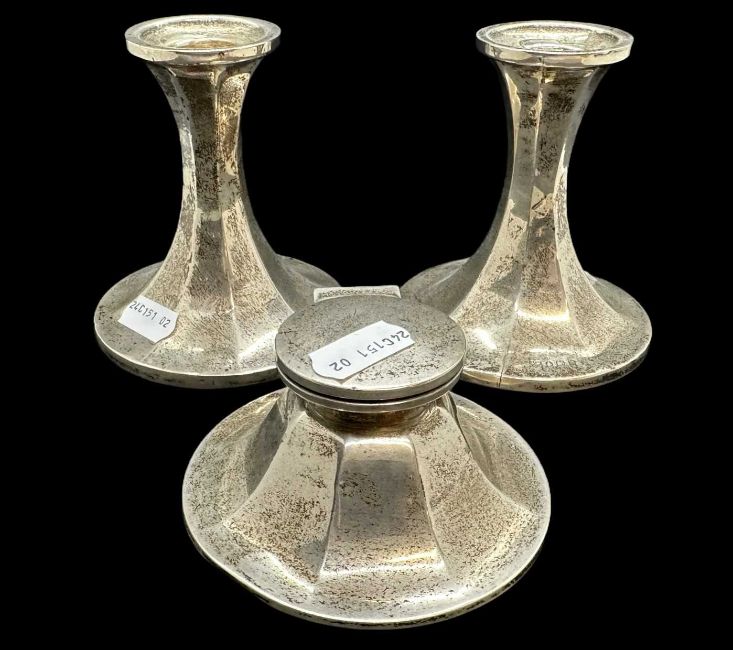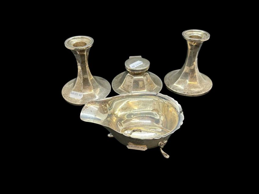 Hallmarked Silver: Silver desk set comprising of inkwell and candlesticks, Birmingham 1919 & 1920. Silver sauce boat, handle detached, weighable 3.1troy oz.