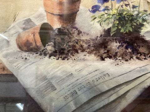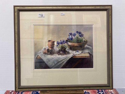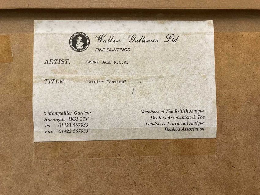 20th cent. Watercolour 'Winter Pansies', signed lower right and verso by the artist and title provenance Walker Galleries Ltd. Harrogate, framed and glazed. 25½cm x 30cm.