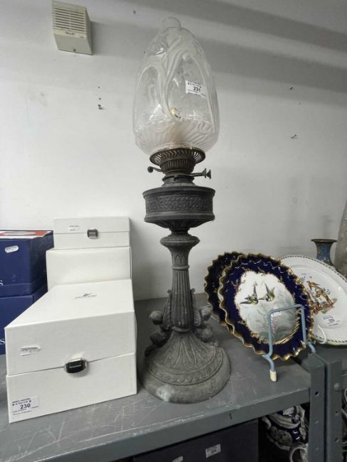 20th cent. Oil lamp on single column with decorative shade. 27ins.