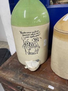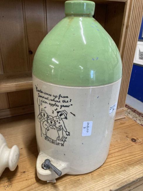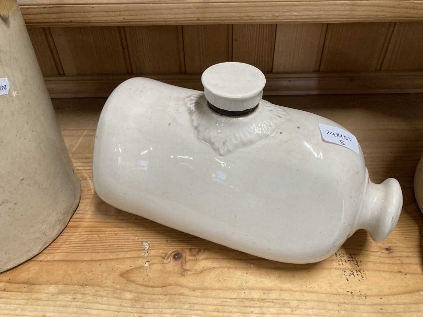Four stoneware domestic vessels English c1880-1920 to include two hot water bottles, a cider flagon, Somerset, with top in good order, and an ale flagon, East Durham Crown Brewery, all in good order.