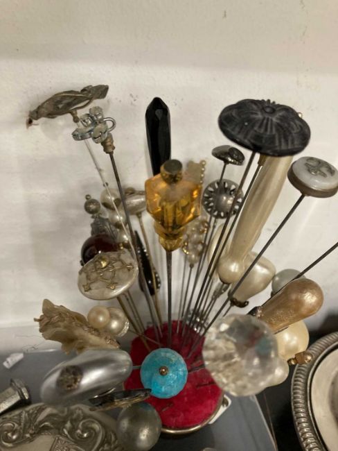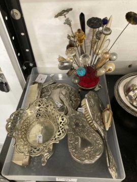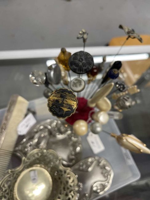 Four-piece silver-plated dressing table set, a pair of knife rests, a bonbon dish, a purple and white paste set cluster ring and a quantity of hat pins.