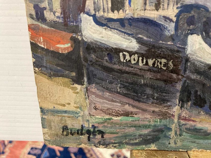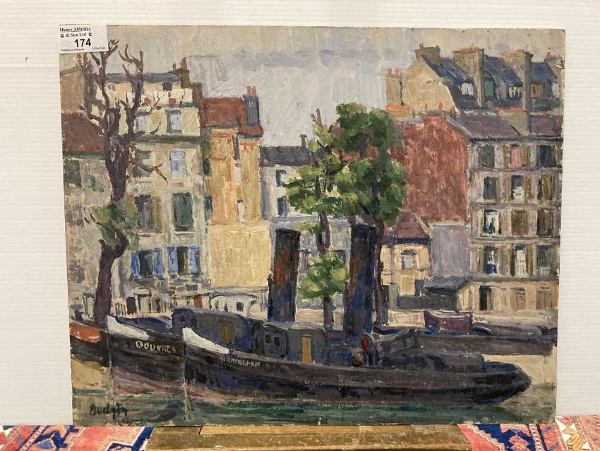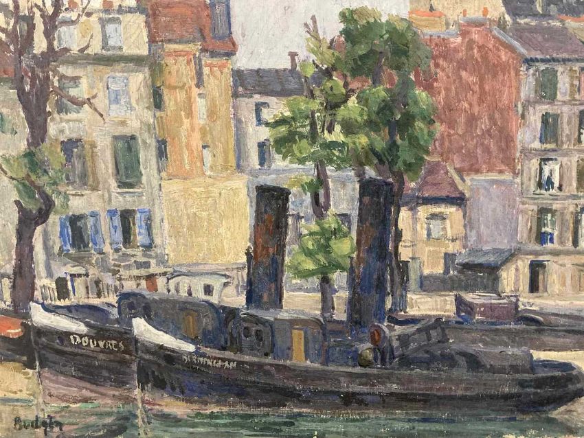 Oil on board 'En Plein Air' study of steam tugs moored together on the canal Charenton-le-pont France (Paris), signed lower left, c1930s. Overall size 41cm x 33cm. Plus another oil on board by Frank Budgen 'En Plein Air' Canal de la Marne, Charenton (Paris), signed lower right and signed to reverse F. S. Budgen 1930. Overall size 41cm x 33cm. (2)