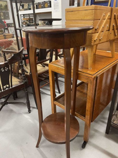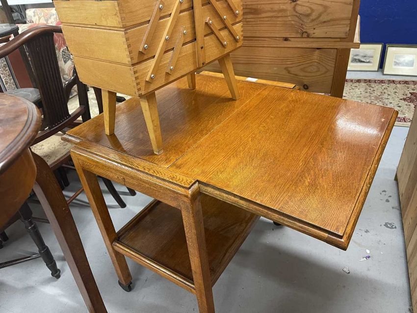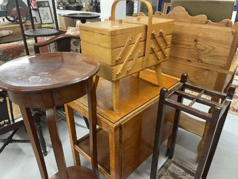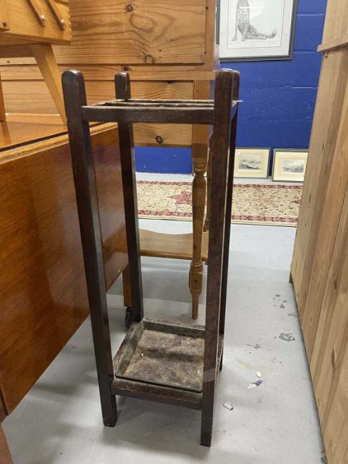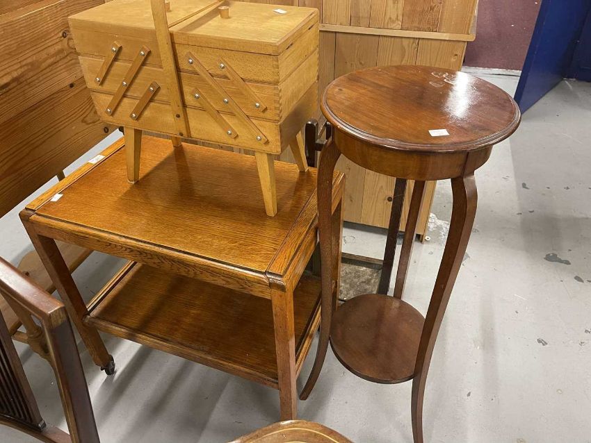 19th cent. Mahogany jardineire stand, an oak stick stand, 20th cent. Oak tea trolley and workbox. (4)