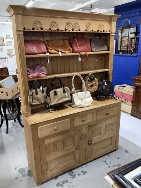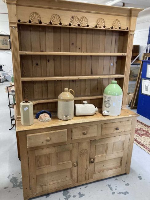 20th cent. Pine dresser and rack the base three drawers over a twin door cupboard topped by a three shelf rack the pediment decorated with carved shells.